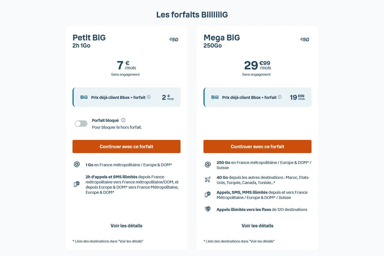 O pacote Mega BiG inclui 250 GB de dados utilizáveis ​​na França continental, na Europa, nos departamentos ultramarinos franceses e na Suíça, bem como 40 GB de mais de 150 destinos internacionais. Entre eles: Marrocos, Estados Unidos, Japão, Turquia, Canadá e até Tunísia. Chamadas, SMS e MMS são ilimitados de e para França, Europa, Territórios Ultramarinos Franceses e Suíça.