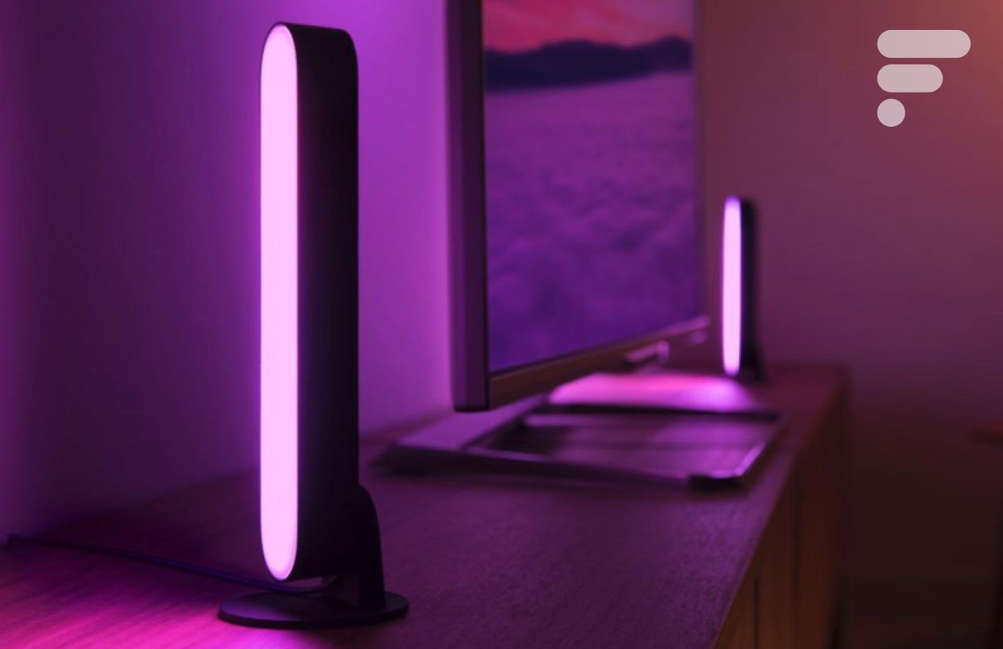 As Philips Hue Play são barras de luz não muito volumosas: com suas dimensões de 360 ​​x 253 x 44 mm, você deverá conseguir encontrar um pequeno lugar para elas em seu interior sem problemas. Num móvel, na vertical, no canto de uma sala ou mesmo na parte de trás de um ecrã de jogo de PC para criar uma retroiluminação doméstica muito envolvente… As possibilidades de instalação são inúmeras. Observe que os suportes são fornecidos. Você pode até conectar o Hue Play atrás de uma televisão para criar o Ambilight, uma tecnologia desenvolvida pela Philips.