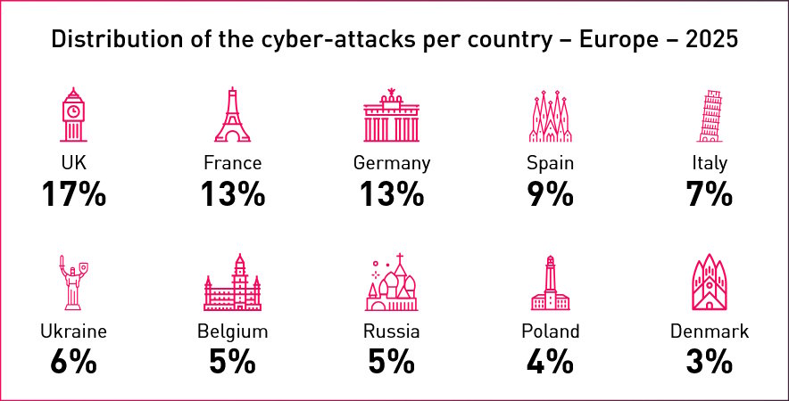 As entidades governamentais representam o setor mais visado (22,3%) e a França é um alvo principal graças à desmaterialização dos serviços online. O Índice de Economia e Sociedade Digital (DESI) de 2025 coloca a França em sexto lugar na Europa em termos de percentagem da população que utiliza serviços digitais.