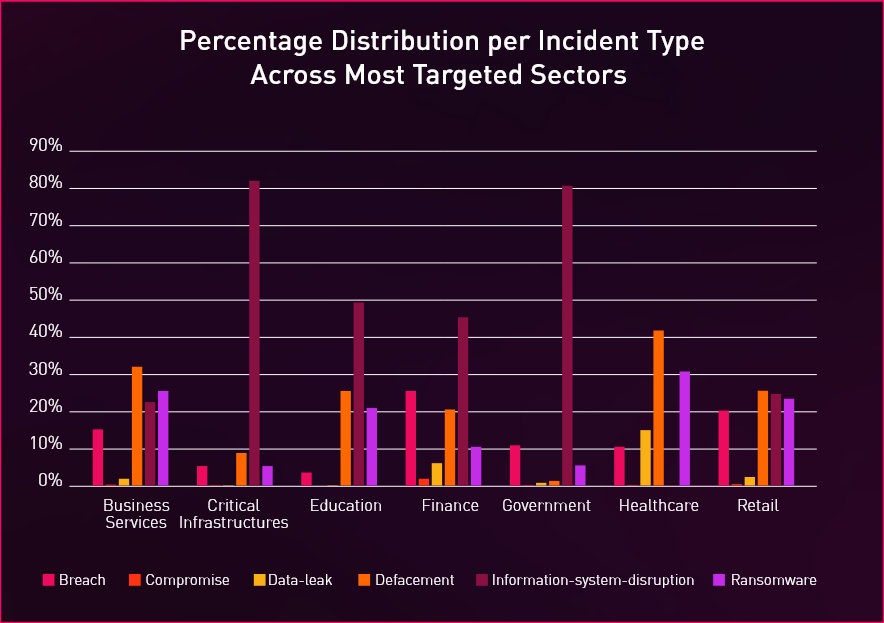 Distribuição dos ataques cibernéticos por tipo e setor na França em 2025. © Check Point