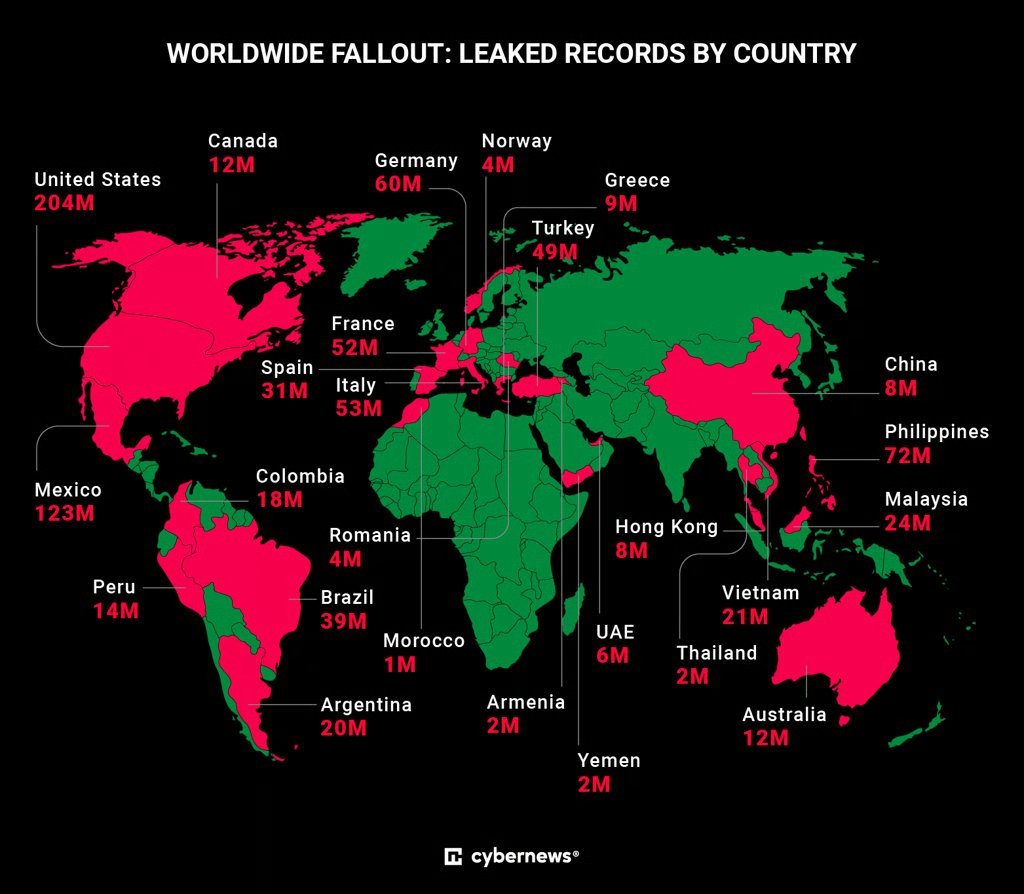 A França continua na liderança com 53 milhões de registos, atrás dos Estados Unidos, México, Filipinas, Alemanha e Itália. A base de dados poderia, portanto, conter potencialmente as informações de todos os adultos em França. De acordo com a Cybernews, eles poderiam ser usados para roubo de identidade, SIM troca (roubo de número de telefone) e engenharia social.