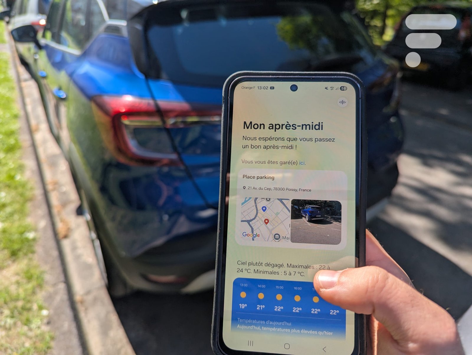 Então seu servo, muito tonto com a vida, pôde notar em seu Samsung Galaxy S24 FE (rodando em One UI 8) uma pequena e inócua mensagem de seu Now Brief: “ Não se esqueça do seu estacionamento. »