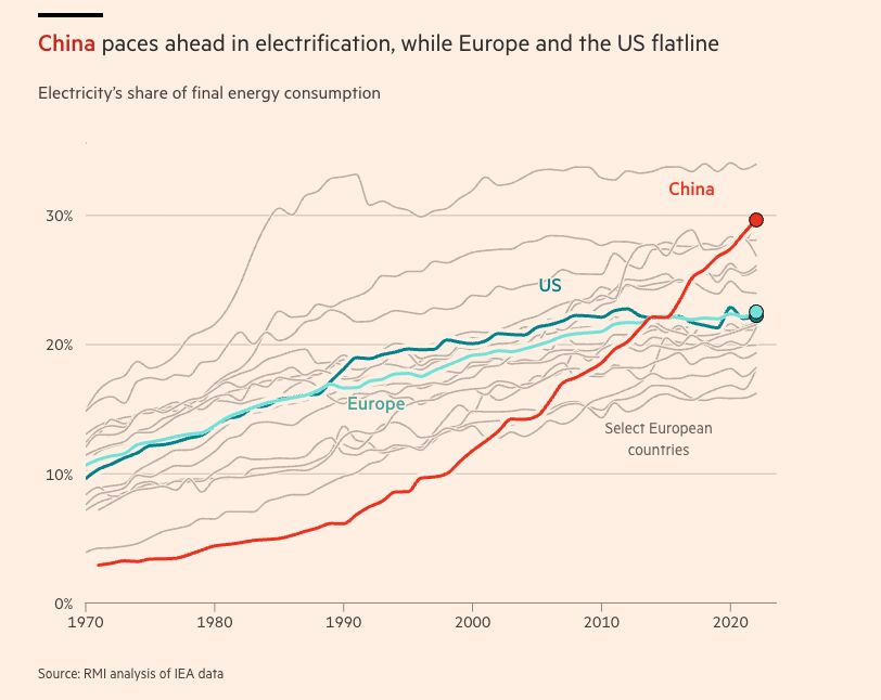 Para Neil Makaroff, especialista em políticas climáticas e energéticas europeias da Fundação Jean Jaurès, “ esse gráfico deveria ser um choque “. “ A China está no caminho da independência energética graças à electrificação muito rápida da sua economia. Enquanto isso, a eletrificação estagna na Europa “.