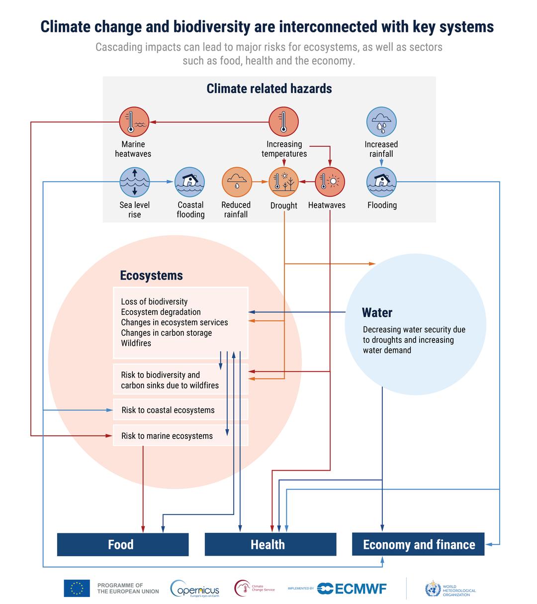 Esta infografia mostra a interdependência entre as alterações climáticas, a biodiversidade e outros sistemas essenciais, como a alimentação, a saúde e a economia. © Estado Europeu do Clima 2025