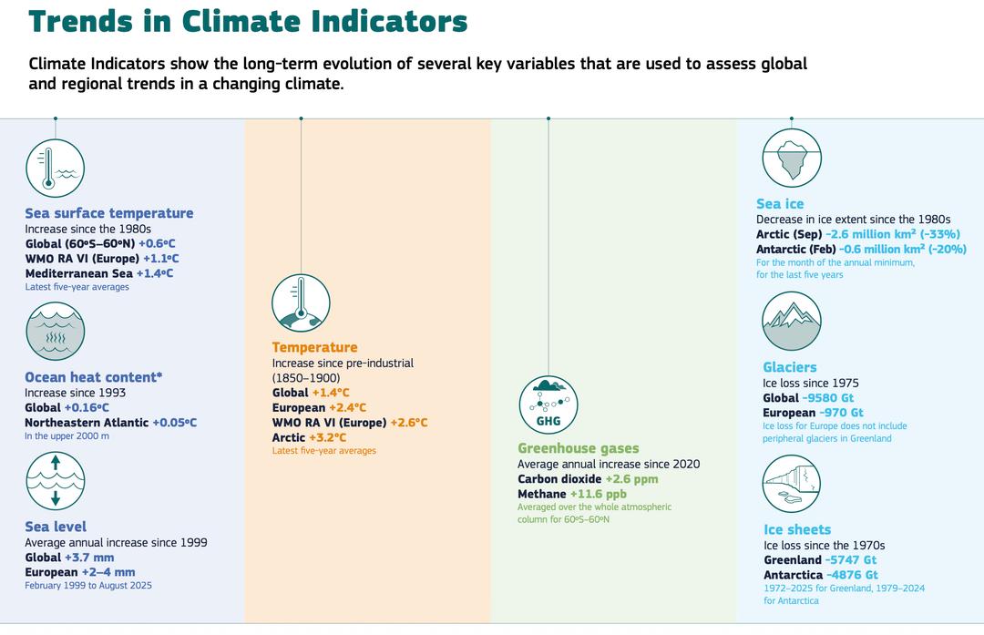 Estes indicadores climáticos mostram a evolução a longo prazo de diversas variáveis-chave utilizadas para avaliar as tendências globais e regionais no contexto das alterações climáticas. © Estado Europeu do Clima 2025