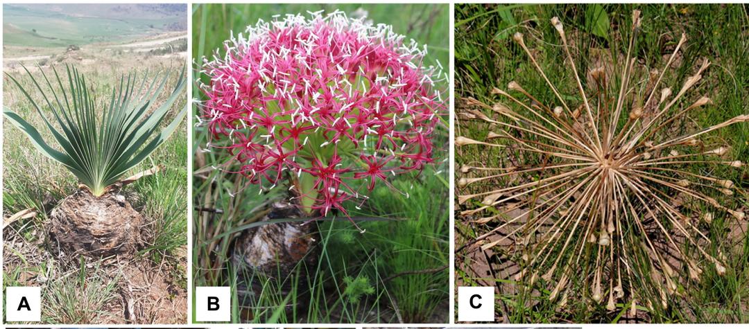 Boofone distichatambém chamada de “planta do século”, é uma planta nativa do sul da África, que possui propriedades terapêuticas e tóxicas. © (A): A. Motala, CC BY-SA; (B) G. Bowers-Winters, CC BY-NC; (C) R. Taylor, CC BY-NC