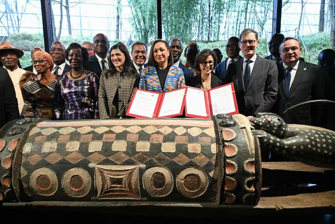 Estas devem ser as últimas semanas que passa no Musée du quai Branly, em Paris, longe da sua terra natal. Roubado há cento e dez anos na aldeia de Adjamé, hoje comuna de Abidjan, a capital económica da Costa do Marfim, o “tambor falante” Djidji Ayôkwé mais uma vez pertence formalmente à Costa do Marfim. Sexta-feira, 20 de fevereiro, as autoridades francesas, representadas pela Ministra da Cultura, Rachida Dati, entregaram-no aos seus homólogos marfinenses durante uma cerimónia de restituição. Esculpido em madeira de iroko, com 3,5 metros de comprimento e 430 quilos, foi saqueado durante a colonização, depois que os franceses entenderam que era usado pelos Atchans (também chamados de Ebriés) como instrumento de resistência.