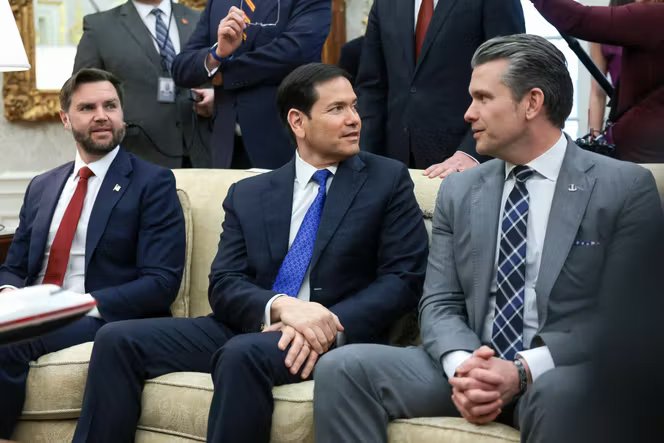 O vice-presidente dos EUA, JD Vance (à esquerda), o secretário de Estado Marco Rubio (centro) e o secretário de Defesa Pete Hegseth durante a visita do chanceler alemão Friedrich Merz à Casa Branca em Washington em 3 de março de 2026.