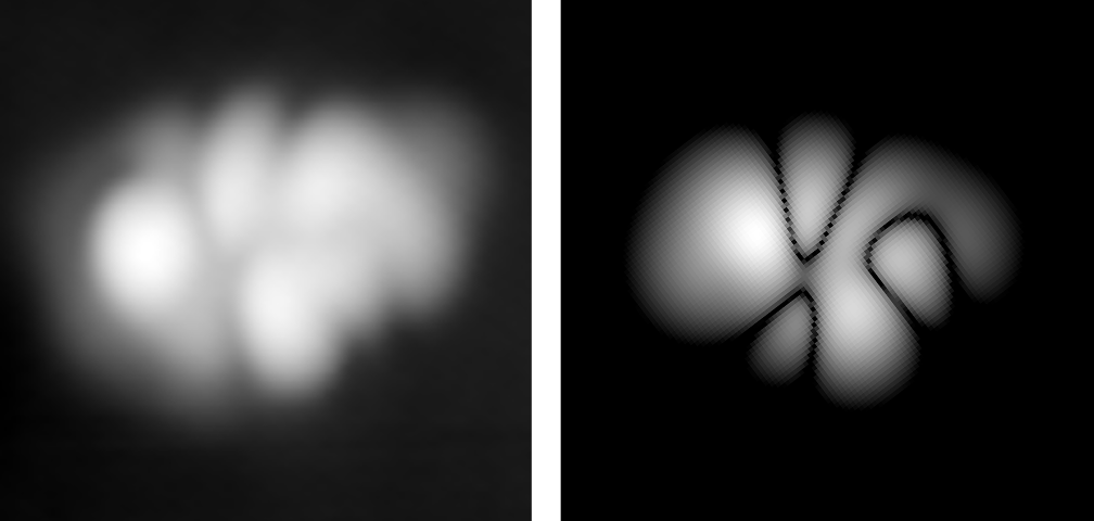 À esquerda, uma imagem de microscopia de varredura por tunelamento da densidade orbital eletrônica da nova molécula meio-Möbius; à direita, uma imagem STM simulada da densidade orbital da molécula, produzida em um computador quântico IBM. © IBM e Universidade de Manchester