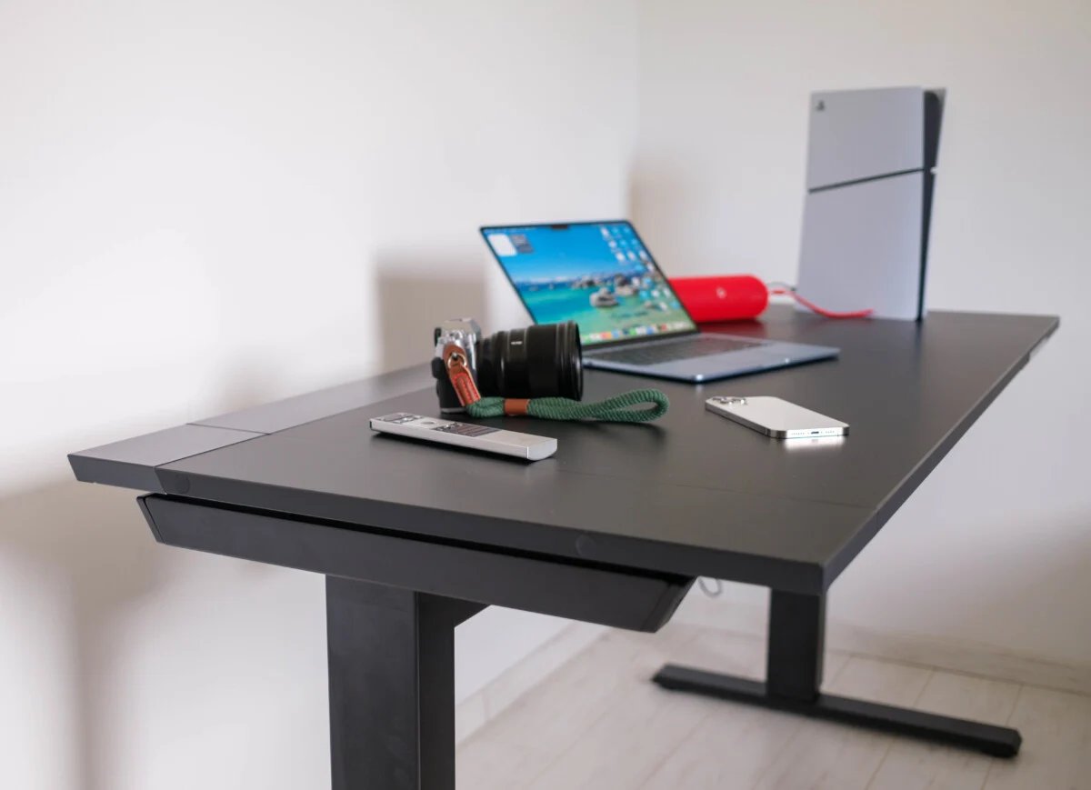 A superfície de aço oferece um toque levemente texturizado, agradável ao toque e retém pequenas impressões digitais. A bandeja de 150 x 64 cm é generosa o suficiente para instalar laptops, tablets, consoles ou monitores.