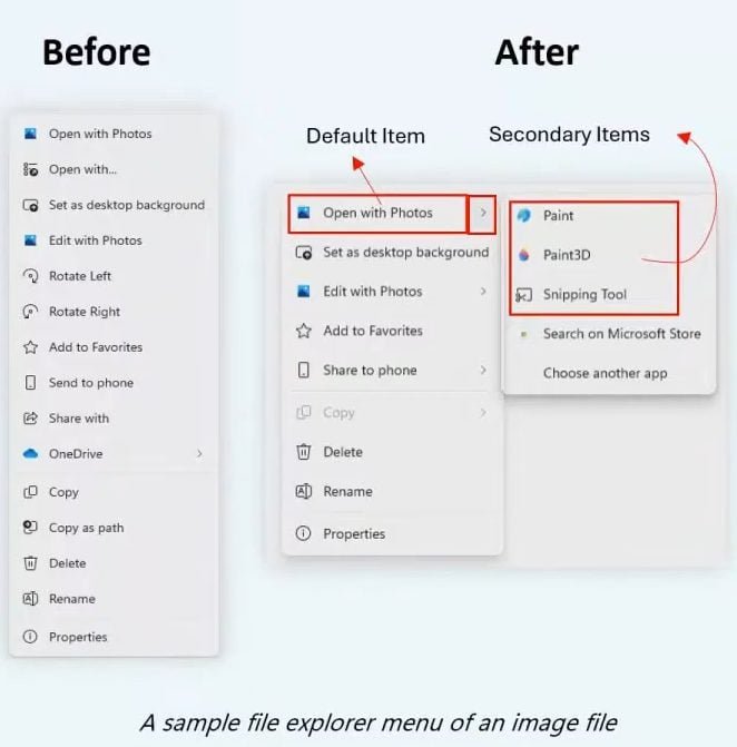 Para resolver o problema, os engenheiros da empresa Redmond irão, portanto, introduzir um sistema para tornar os menus mais intuitivos e, acima de tudo, mais eficientes. Concretamente, a Microsoft pretende modificar estes menus para que o seu conteúdo se adapte à seleção do usuário no File Explorer. Para isso, introduzirá um sistema de menus aninhados, que os desenvolvedores poderão usar para definir uma ou mais ações padrão e ações secundárias em um submenu associado.