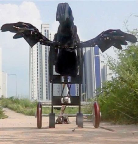 Esta versão robótica do “Caudipteryx” testa a hipótese de asas destinadas a assustar as presas durante a caça. Crédito: JINSEOK PARK, PIOTR JABLONSKI ET AL.