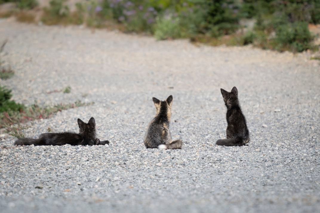 Essas pequenas raposas vermelhas Cascade conhecem a paciência. Eles esperam que seus pais voltem com a refeição. © Gretchen Kay Stuart