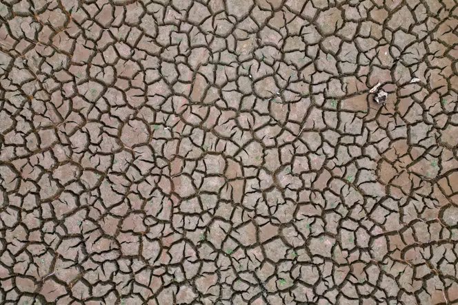 Vista aérea do solo rachado em uma área anteriormente submersa durante uma seca em Joanópolis, Brasil, 11 de dezembro de 2025.