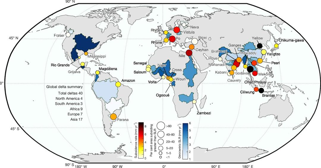 Olhando mais de perto, quase todos os deltas estudados estão afundando localmente mais rápido do que o nível do mar, com exceção do delta do Rio Grande. Em 38 deltas mais da metade da superfície analisada sofreu subsidência durante o período estudado e em 19 deles incluindo o Mississippi o Nilo ou o Ganges-Brahmaputra, mais de 90% das terras são afetadas.