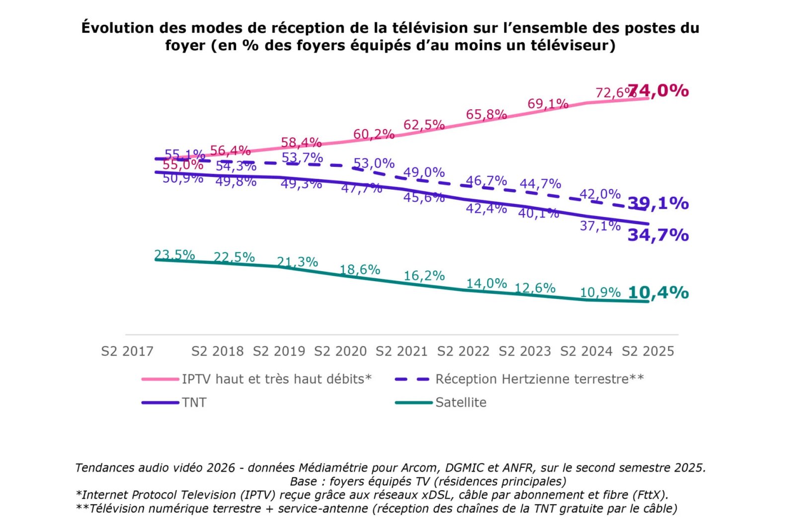 Os números publicados pelo regulador são definitivos. No segundo semestre de 2025, a recepção via caixa de internet (IPTV) passou a equipar 74% dos lares com televisão. Ao mesmo tempo, apenas 34,7% dos agregados familiares ainda recebem TDT em pelo menos uma estação, uma queda de 7 pontos em cinco anos. Os domicílios que dependem exclusivamente da antena rake caíram para 14,4%.