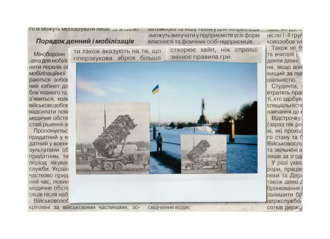 Colagem feita a partir de recortes de jornais ucranianos e uma foto do monumento à Mãe Ucrânia (Museu de História da Ucrânia na Segunda Guerra Mundial), tirada em Kiev, 16 de janeiro de 2024.