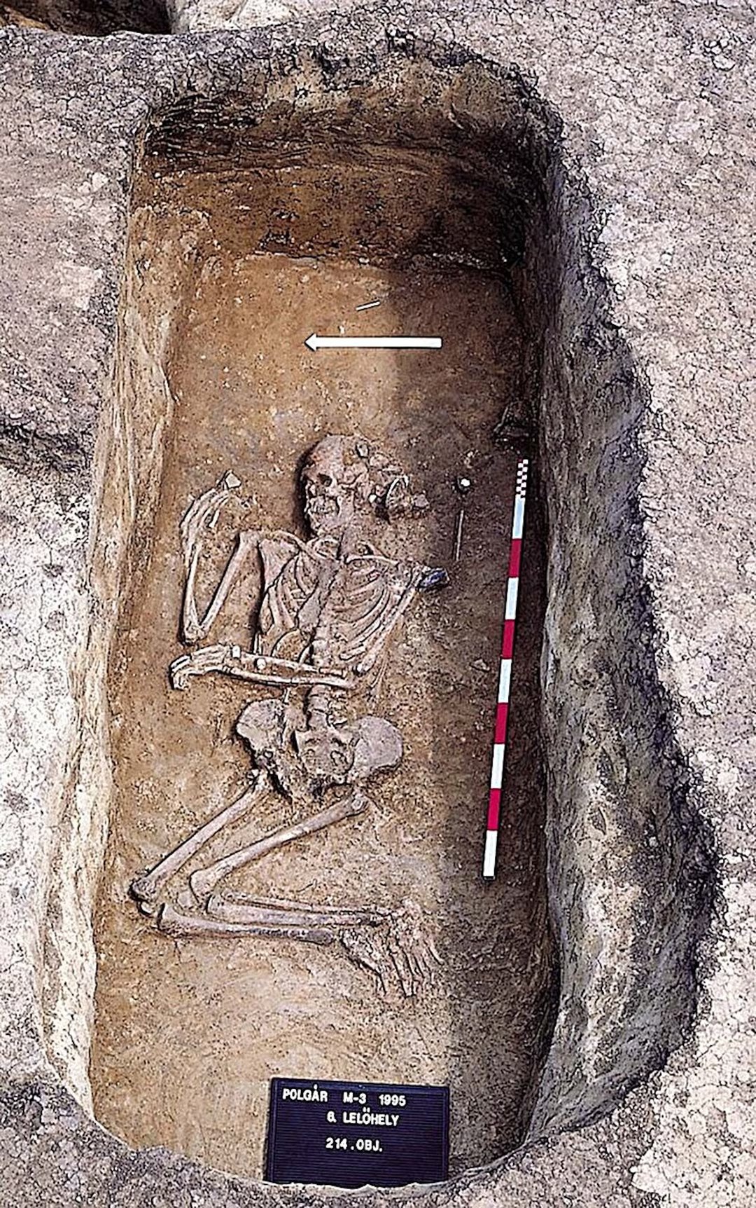 Enterro masculino característico de Csőszhalom: um homem enterrado do lado direito, acompanhado por uma ferramenta de pedra polida colocada perto do ombro esquerdo. © Alexandra Anders