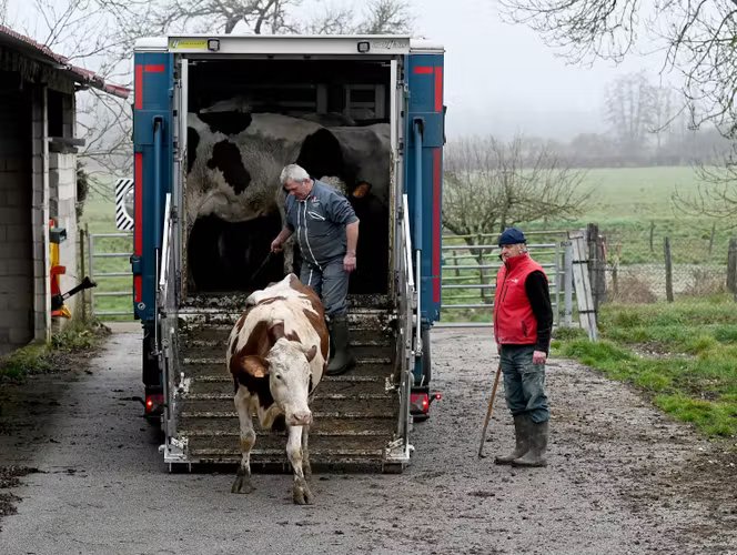 Um lote de vacas é entregue a um agricultor de Ecleux (Jura), para repovoar a sua exploração cujas vacas foram abatidas em outubro de 2025 devido a uma doença contagiosa de pele protuberante, em 20 de janeiro de 2026.