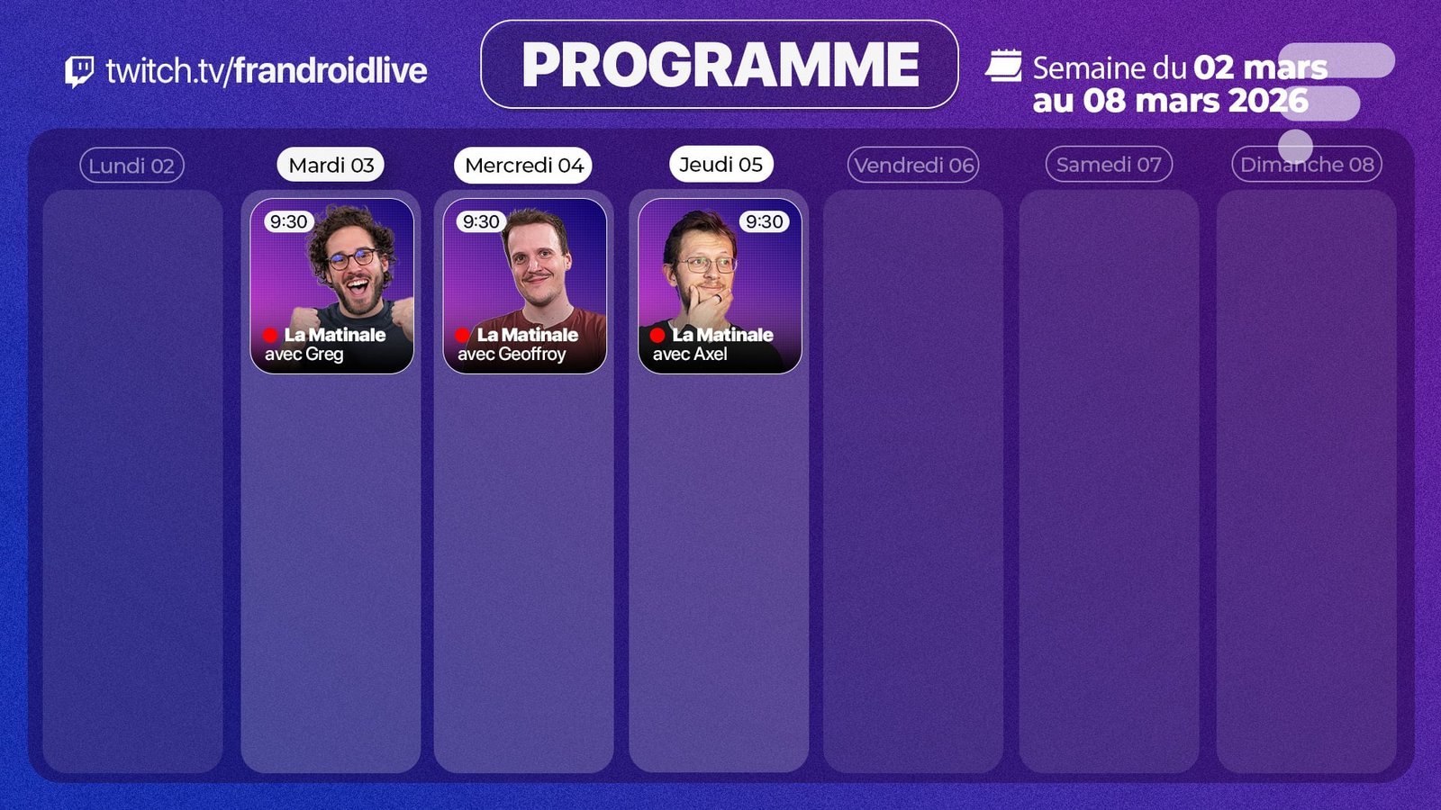 Nosso programa Twitch para a semana de segunda-feira, 2 de março de 2026, está aqui: nos vemos, terça, quarta e quinta-feira em nosso canal Frandroidlive, para um triplo Tech Morning.