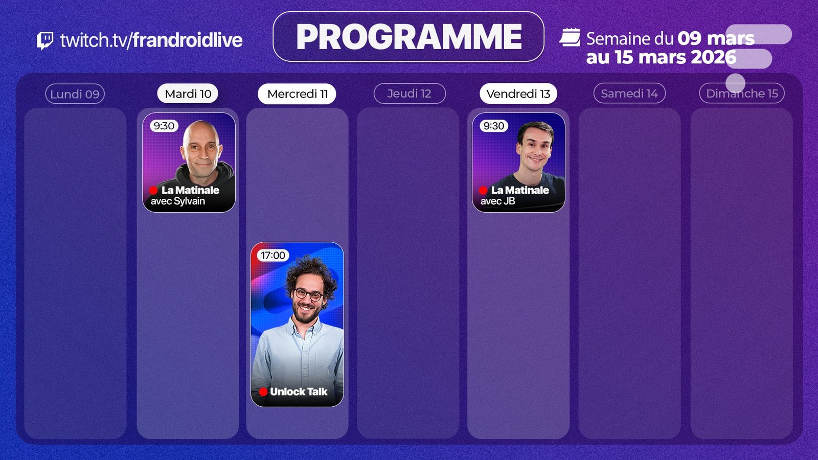Nosso programa Twitch para a semana de segunda-feira, 9 de março de 2026, está aqui: nos vemos, terça, quarta e sexta-feira em nosso canal Frandroidlive, para um Tech Morning duplo e o retorno do Unlock Talk.