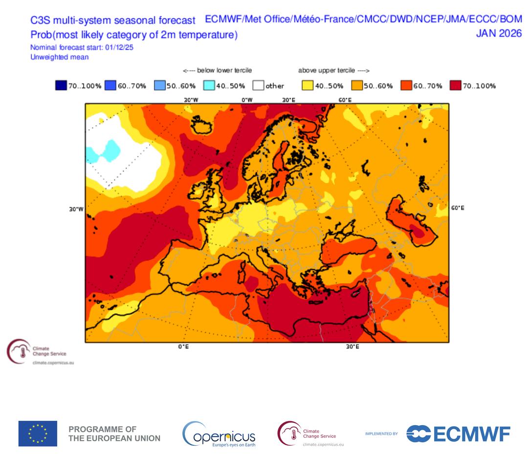 - clima mais ameno a partir de meados de janeiro: as temperaturas estarão em linha com as médias sazonais ou mais altas. Tempo possivelmente mais seco é esperado depois de 15 de janeiro, mas até o momento a previsão é muito incerta em relação precipitação.