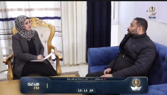 Num pequeno estúdio em Deir Al-Balah que parece uma sala de estar íntima, sentada numa poltrona com estrutura dourada, a jornalista Sylvia Hassan prepara-se para entrar em direto. Enquanto as 23 estações de rádio da Faixa de Gaza foram destruídas por Israel, tal como todo o território, após o ataque terrorista do Hamas de 7 de outubro de 2023, a apresentadora inaugura com a sua voz Hona Ghazza (“aqui Gaza”), a primeira estação de rádio a transmitir a partir do território, após mais de dois anos de silêncio.