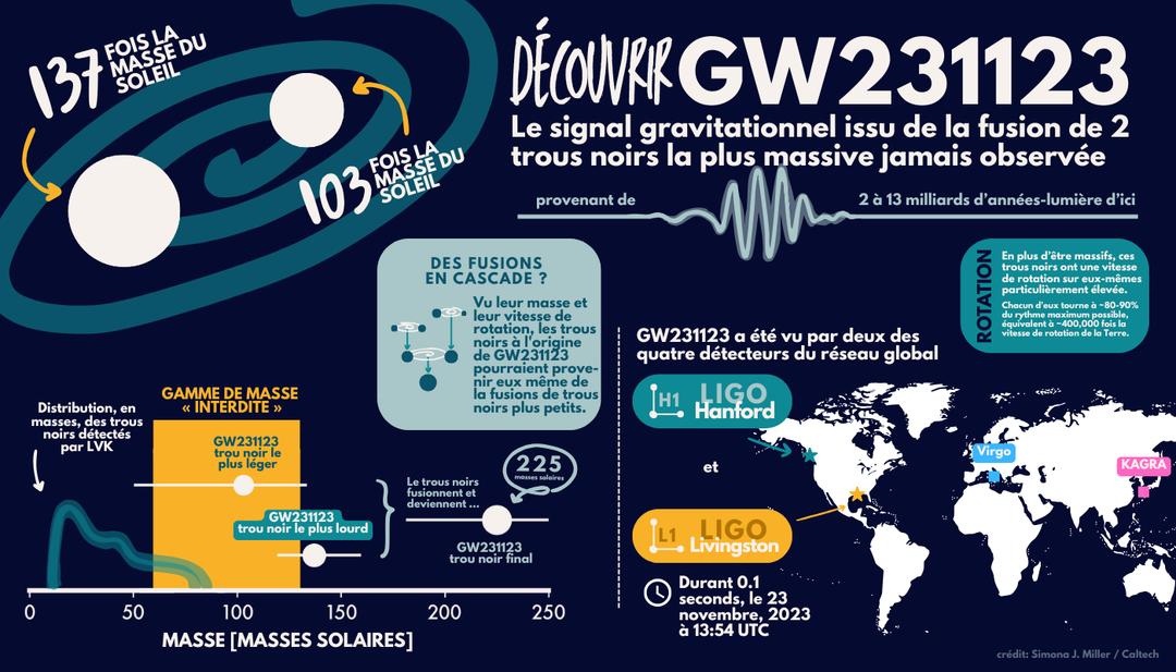 O que nos lembra a detecção de sinal GW231123 anunciado pela colaboração LVK em julho de 2025: a fusão de dois buracos negros de 103 e 137 massas solares, girando extremamente rapidamente. A coisa toda aconteceu em algum lugar entre 2 e 3 bilhões de anos-luz da Terra. Os astrónomos notaram então que estas características provavelmente ultrapassariam os limites dos modelos teóricos atuais. Na verdade, eles têm dificuldade em explicar a existência de tais buracos negros massivos. A menos que fusões sucessivas sejam invocadas.
