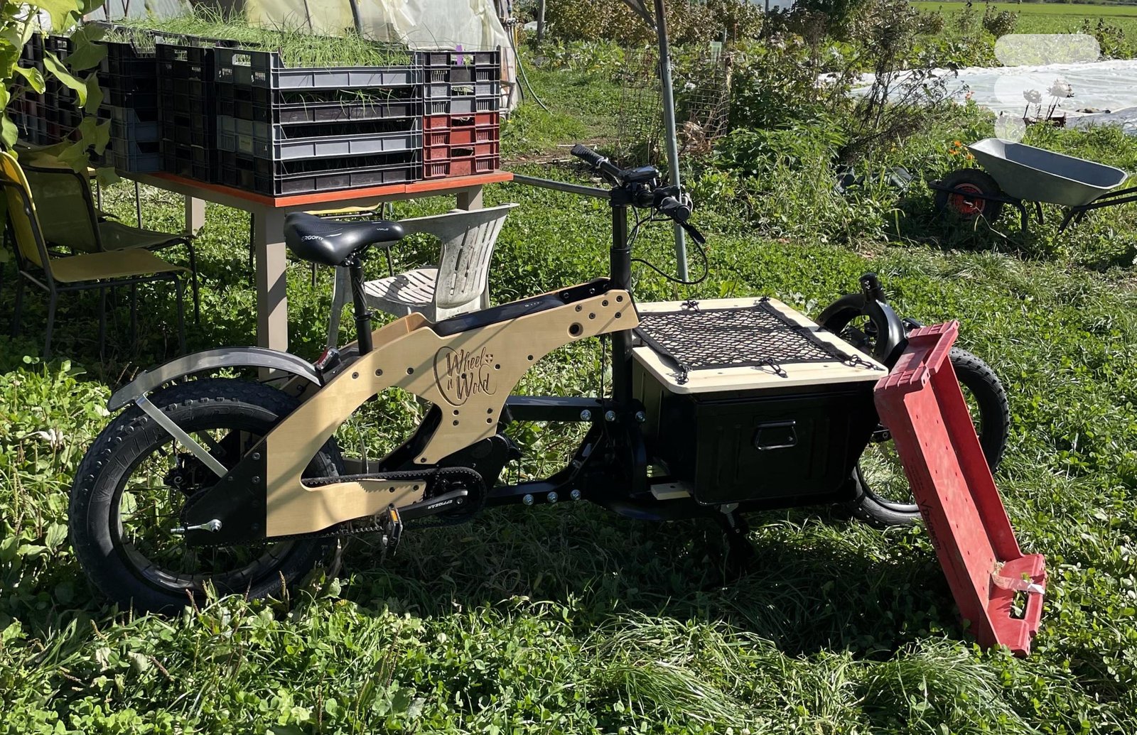 Casar com ele perna de madeira » na bicicleta elétrica e a experiência Ello Mobilité na bicicleta utilitária, o porta-duas rodas Wheel’n Wood 2074 Cargo, fabricado na França, é tão prático quanto único.