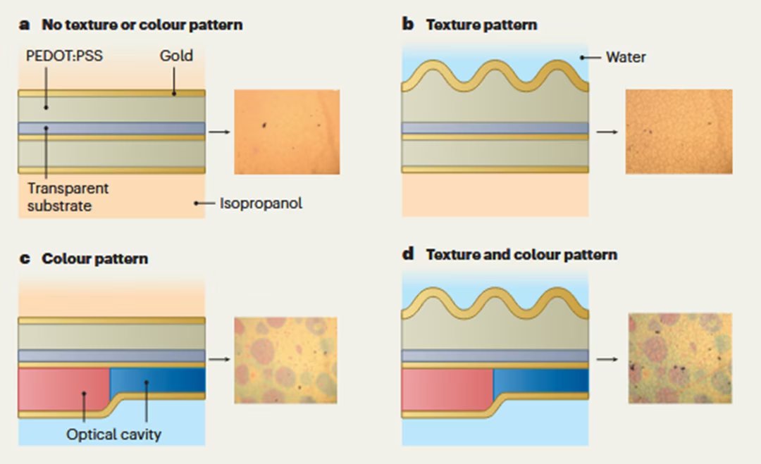 Em comparação com estudos anteriores sobre esse tipo de tema, a grande mudança aqui é o fato de que a cor e a textura podem ser alteradas de forma independente. Por exemplo, a maior parte materiais capazes de mudar sua cor trabalham com nanoestruturas que interagem de diferentes maneiras com o luz e refletir diferentes comprimentos de ondalevam a um efeito óptico exibindo cores variáveis.