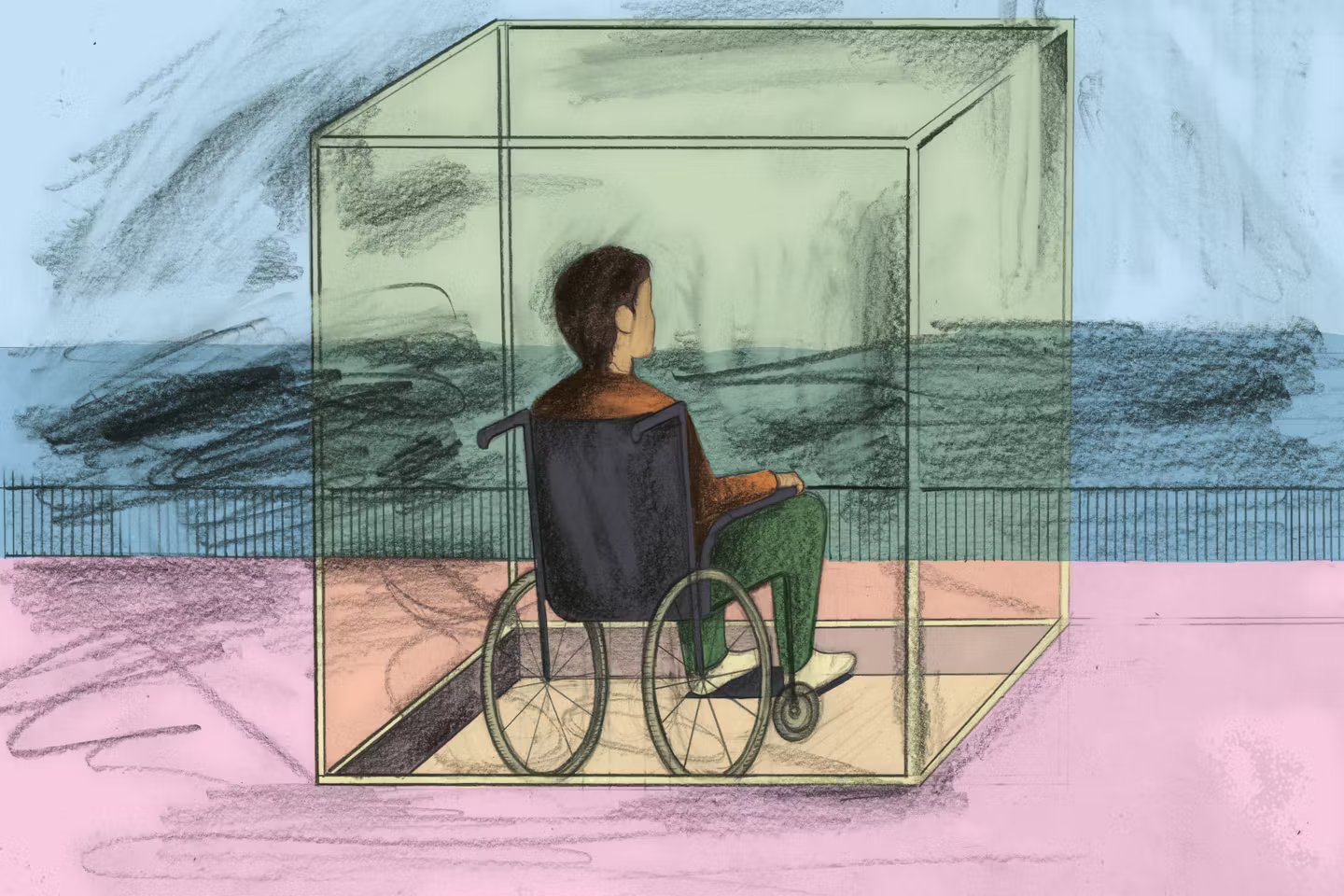 O sentimento de vulnerabilidade é uma patologia devastadora, que corrói o que resta dos meus alicerces. Eu constantemente me autodiagnostico. Verifico, minha pressão parece boa, meu pulso está batendo com calma, estou procurando, estou atento, onde ficam as saídas de emergência? Eu me sinto em perigo o tempo todo. Mesmo nas ruas tranquilas do meu bairro: tenho medo de que uma figura salte atrás de mim e me derrube e arrebate minha bolsa quando dou pequenos passos para frente, apoiado na bengala. Cada barulho é uma sirene de alarme. A que distância está esse motor que ouço? Carro, scooter, trator? Levante-se e corra! Eu não seria capaz de sair de um veículo destruído. Até mesmo agitar os braços para pedir ajuda é impensável. A palavra incêndio faz minhas têmporas latejarem, caos, desastre de trem, alerta, devemos evacuar o mais rápido possível, não demore. Ajuda Em inglês. Ajudame em espanhol. SOS em linguagem de sinais de pânico.