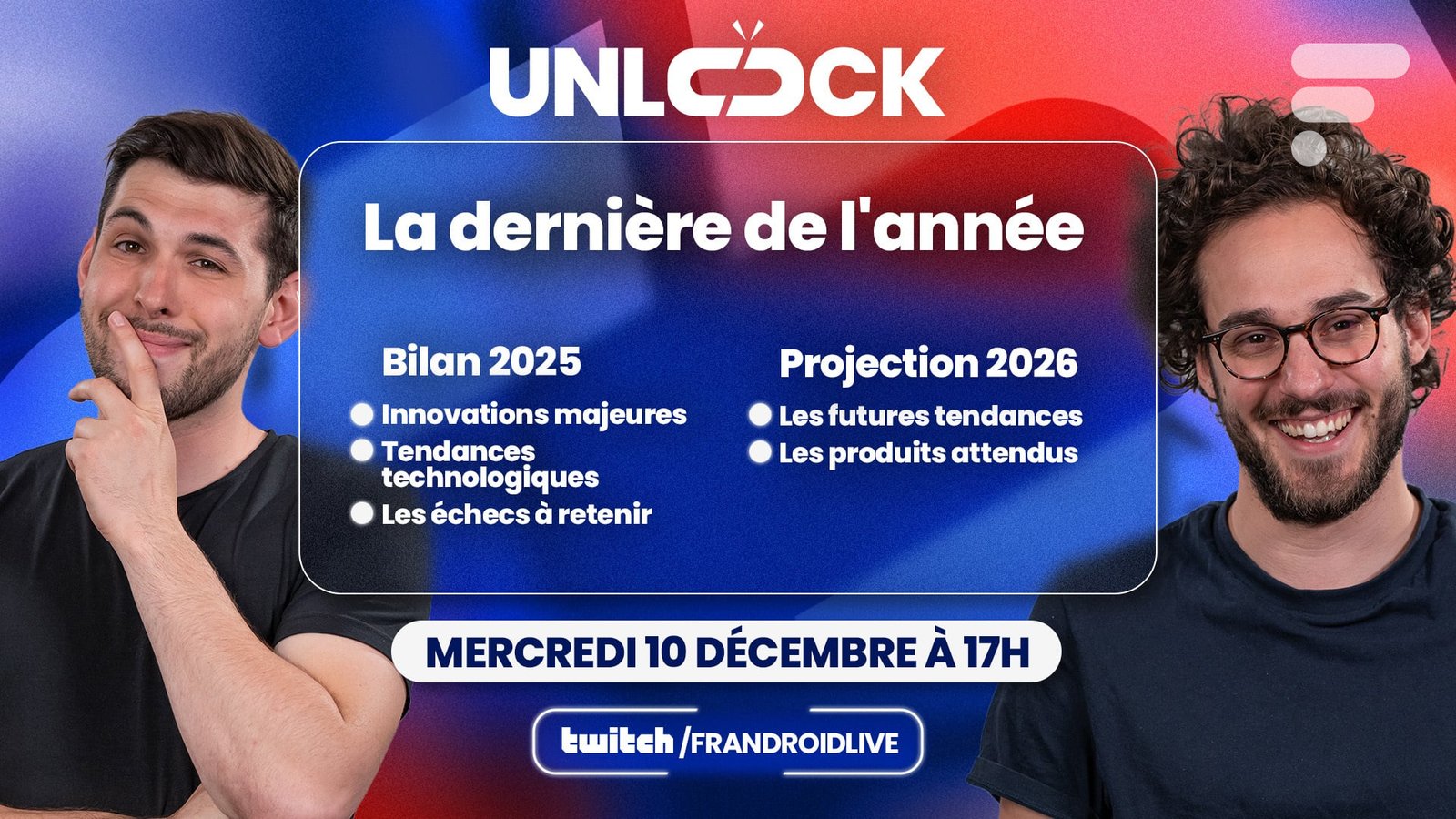 Unlock Talk é o programa de tecnologia Frandroid que disseca as novidades, testa produtos e analisa as principais tendências tecnológicas do ano. No Twitch, no YouTube e no podcast, este encontro bimestral alterna debates no set, demonstrações concretas e visões críticas sobre tecnologia, desde o mais recente smartphone até os desafios da inteligência artificial.