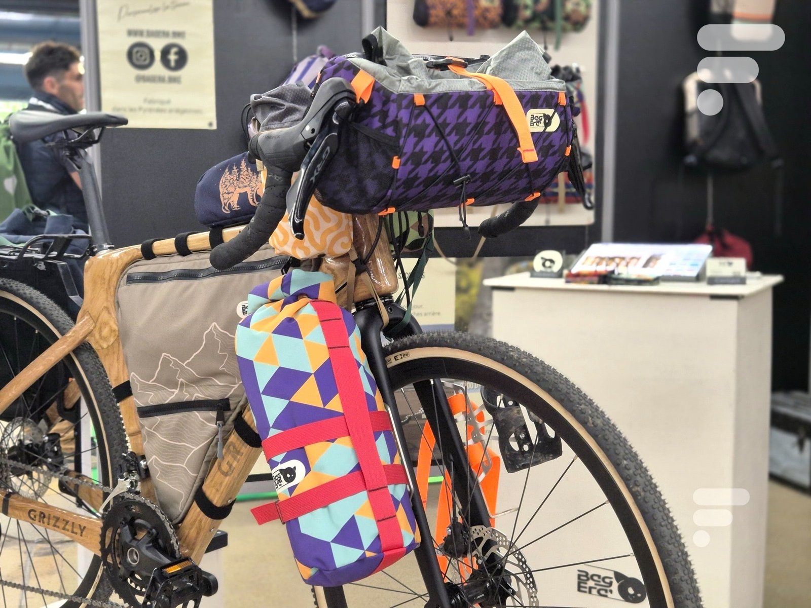 Um estande colorido, difícil de perder nos corredores do desfile da Vélo em Paris. Esta posição, é o de Bag’Erauma marca francesa muito recente lançada em dezembro de 2025 após três anos de desenvolvimento liderado por Gaston e Alice Bradel, desenvolvedor por um lado e modelista costureira por outro.