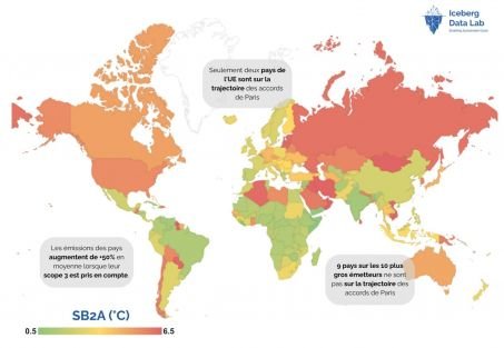 A pegada de carbono dos países reflete os níveis de desenvolvimento. Em verde, os países em fase com aumento de temperatura de 0,5°C, em vermelho, aqueles que estão com aumento de 6,5°C. © Laboratório de dados Iceberg