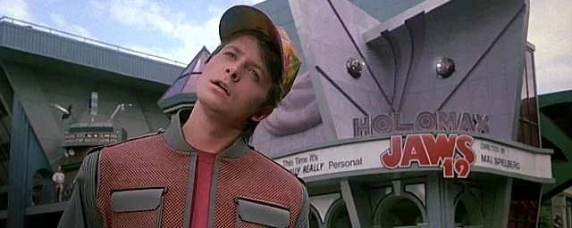 A cena permanece gravada nas memórias: Marty se depara com um holograma gigante representando um tubarão, anunciando o lançamento de um improvável Mandíbulas 19dirigido por um certo Max Spielberg. Por trás dessa piada está uma crítica sutil, mas incisiva, à proliferação de sequências na indústria cinematográfica. Na época, a saga Tubarão já estava em seu quarto filme, sugerindo que Hollywood caminhava para a saturação da franquia.