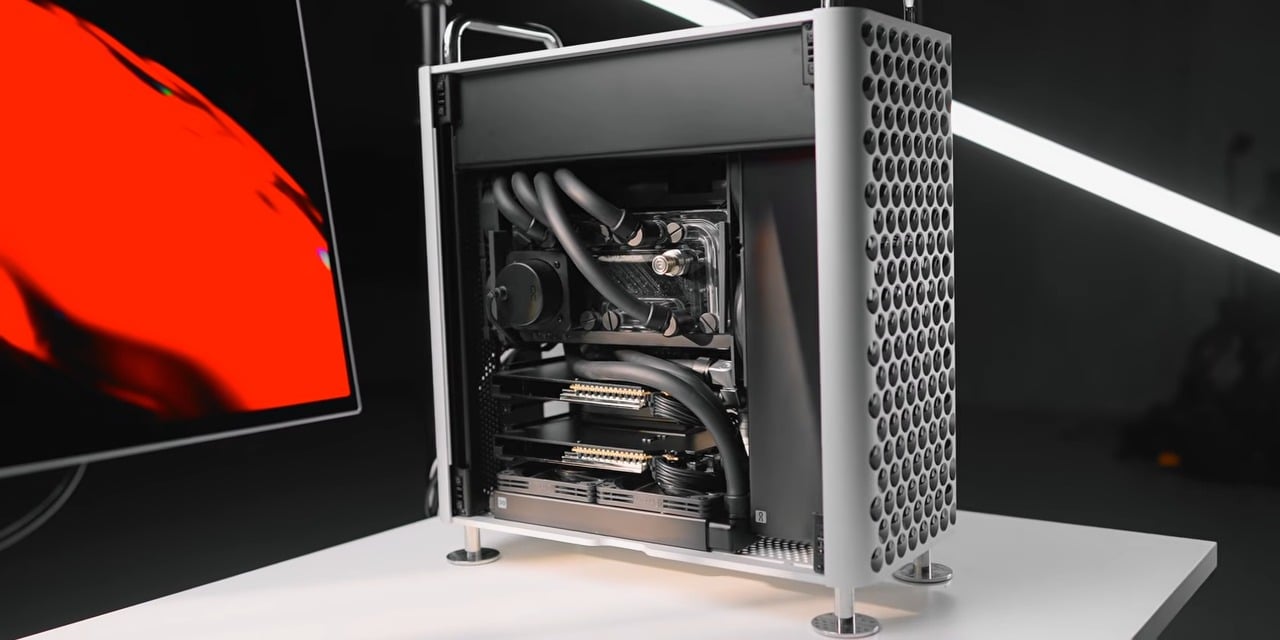 Primeira coisa a saber: a estética não foi sacrificada no altar do poder. A Optimum usou o Apollo X, um case que imita quase perfeitamente o design do “ralador de queijo” do Mac Pro da Apple. Mas por dentro é outro mundo. Para acalmar toda essa gente linda, tínhamos que ser astutos. Ele usou radiador frontal “Monster” da Alphacool, com 86 mm de espessura. É três vezes mais espesso que um radiador padrão.