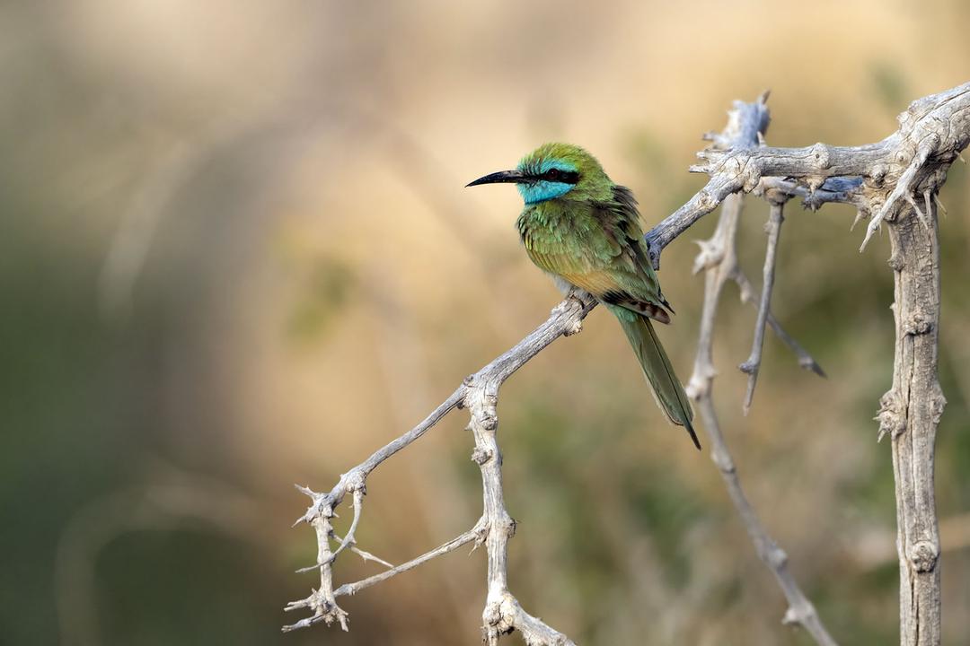 Uma pérola viva suspensa entre o céu e a areia, o Abelharuco Oriental (Merops orientalis) ilumina as paisagens de Omã com seus reflexos verdes e turquesa. Este caçador de insetos, com perfeita agilidade, capturar abelhas e libélulas no meio do vôo antes de derrubá-los com um golpe forte em um galho. A sua silhueta esbelta, os seus cantos e o seu voo rápido pontuam os oásis e wadis, trazendo uma nota de leveza ao deserto.