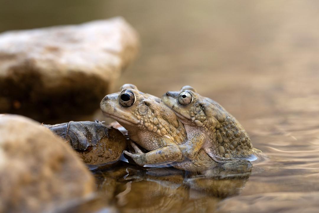 Sclerophrys arábica — renascimento em águas efêmeras. Graças às chuvas raras, os sapos árabes encontram-se nos wadis para acasalar e perpetuar a vida. O seu abraço, breve e essencial, sela o frágil ciclo do deserto. © Maxime Briola, todos os direitos reservados