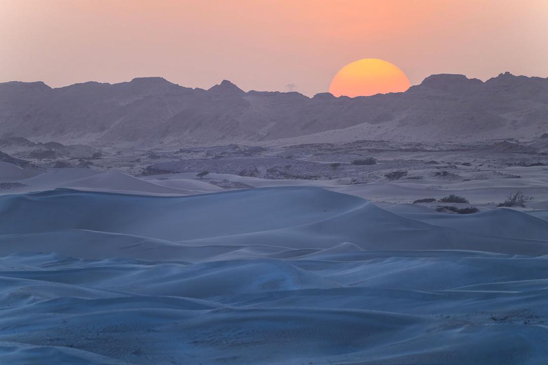 Sugar Dunes — quando o deserto se transforma em um mar de luz. Sob o último suspiro do sol, as dunas ficam enfeitadas de azul e dourado. O vento esculpe-os, apaga-os, recria-os — como se a própria areia respirasse ao ritmo do dia que desvanece. © Maxime Briola, todos os direitos reservados