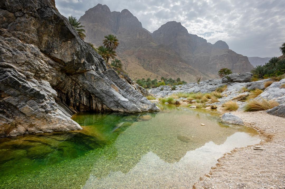 Wadi al Arbeieen — um espelho de água no coração da pedra. Situado nas montanhas Hajar, este wadi abriga uma biodiversidade insuspeitada. Suas piscinas de águas límpidas, alimentadas por chuvas raras, oferecem refúgio a anfíbios, pássaros e insetos numa paisagem de rocha e luz. © Maxime Briola, todos os direitos reservados