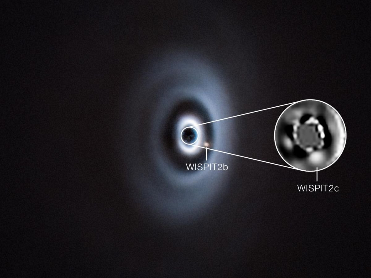 Como são esses recém-nascidos? Tem gigantes gasosos, mas muito mais imponentes que nossos Júpiter e Saturno. WISPIT 2b, descoberto primeiro, tem uma massa próxima de cinco vezes a de Júpiter. Evolui muito longe da sua estrela, 8,5 mil milhões de quilómetros, muito além de Plutão, no nosso próprio sistema solar. O WISPIT 2c está localizado muito mais perto, a cerca de 2 mil milhões de quilómetros de distância. É mais massivo que a sua irmã, entre 8 e 12 vezes a massa de Júpiter. O seu “sol”, a estrela WISPIT 2, tem apenas 5 milhões de anos. Ainda está rodeado por um vasto disco de gás e poeira, estruturado em anéis e sulcos. “Estas estruturas sugerem que outros planetas estão se formando, que eventualmente detectaremos“, explica Chloe Lawlor (Universidade de Galway, Irlanda), autora principal do estudo, num comunicado de imprensa do ESO.