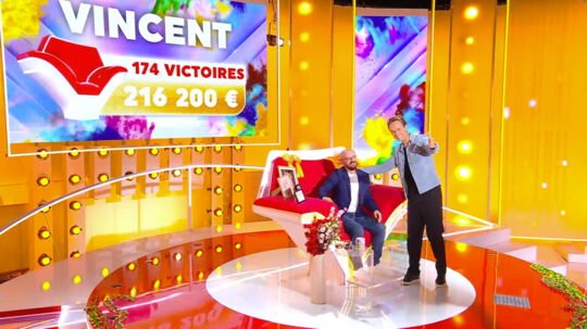 Vincent, porém, se sai melhor do que Marie-Christine em um ponto: a quantia que ganhou com suas vitórias! Nesta terça-feira, 7 de abril, o prémio total do actual inquilino da poltrona vermelha ascende a 216.200 euros. Um recorde no espectáculo, o maior campeão do jogo tendo parado nos 196.900 euros. Ele o ultrapassou em 24 de março.