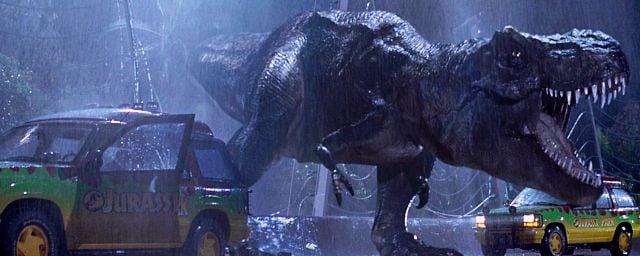 Uma perna de cabra ensanguentada atinge o para-brisa de um dos carros, os cabos elétricos cederam um após o outro e um monstro gigantesco saiu da escuridão. O grito que o T-Rex solta neste momento marcará para sempre a história do cinema.