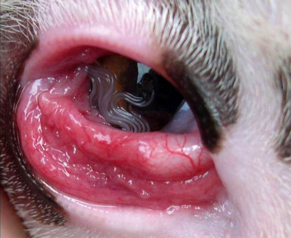 No site da Esccap, associação que fornece informações sobre parasitas e micoses em cães e gatos, ficamos sabendo que os vermes Thelazia callipaeda os adultos vivem e se reproduzem nas partes superficiais do olho (córnea, sob as pálpebras, canais lacrimais) dos animais. Eles vêm de ovos postos por vermes fêmeas, que, ao eclodirem, liberam larvas nas secreções lacrimais.