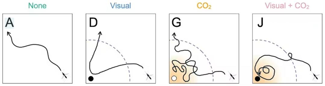 Dependendo dos sinais, os mosquitos adotam comportamentos diferentes. Um alvo preto atrai mosquitos, mas eles não fazem mais do que voar em direção a ele sem se demorar. Um objeto branco e CO2 atrair mosquitos apenas nas proximidades. Uma esfera preta e CO2 são os que mais eficazmente atraem os mosquitos, retendo-os e encorajando-os a atacar. © David L. Lu, Georgia Tech