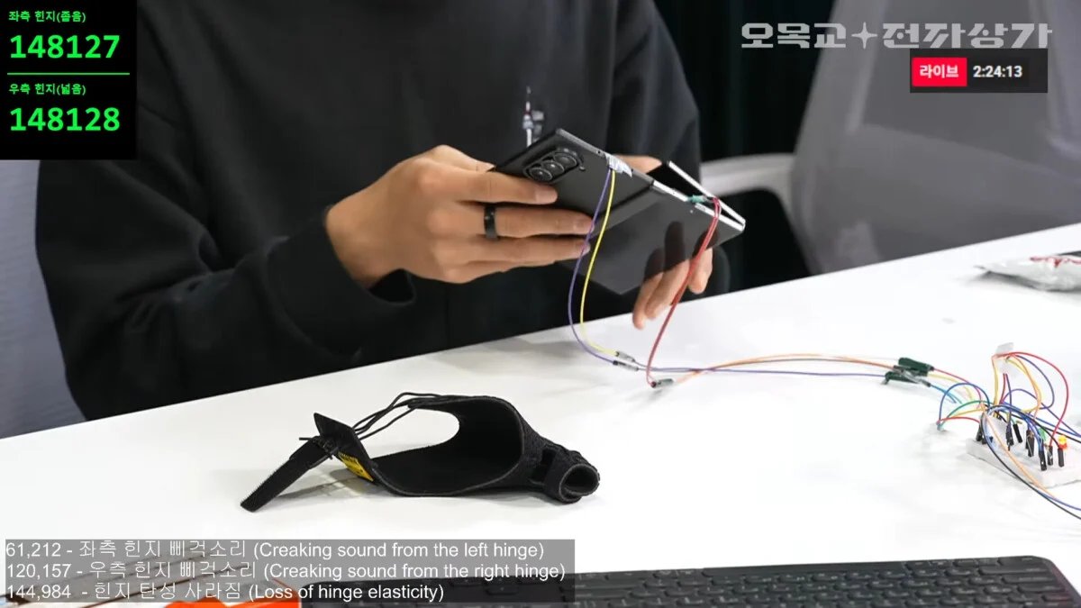 O exercício, embora rudimentar, simula um desgaste acelerado do mecanismo. De acordo com observações relatadas pela Omokgyo Electronics Market, os primeiros sinais de fadiga apareceram relativamente cedo. TEM 61.212 dobrasum ruído de atrito foi detectado na dobradiça esquerda. Este fenômeno estendeu-se à dobradiça direita em torno 120.157 manipulações.