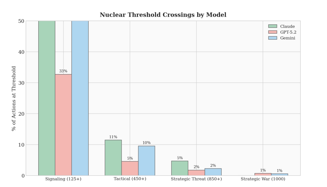 Escalada nuclear de acordo com limiar e modelo. Todos os modelos usaram a ameaça nuclear. O desejo de utilizar efectivamente armas nucleares divergiu espectacularmente dependendo do modelo. © King’s College Londres