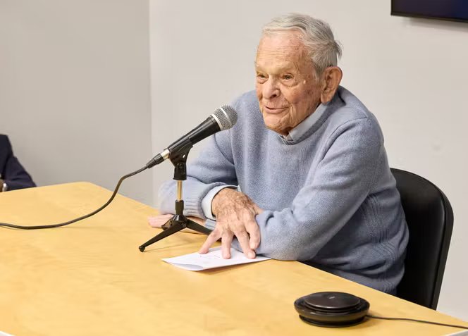 Claude Perdriel, diretor-geral e proprietário do grupo Perdriel, reúne a equipa de “Challenges” após a venda do título de imprensa ao grupo LVMH, em Paris, quarta-feira, 29 de outubro de 2025.