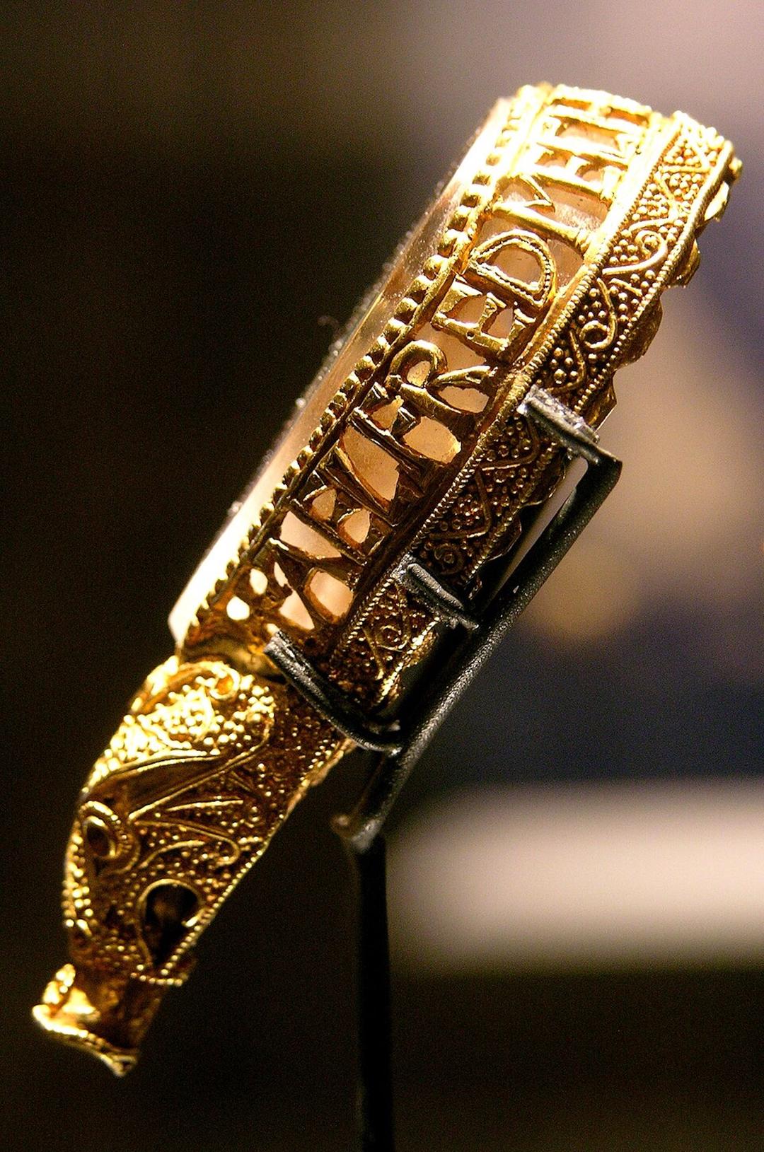 Algumas palavras gravadas em ouro são suficientes para ligar esta joia medieval a uma figura fundadora da história inglesa. © Giles Watson, Wikipédia