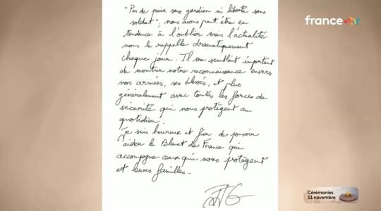 A dois dias do décimo aniversário dos atentados de 13 de novembro de 2015, os franceses celebram outras comemorações, as de 11 de novembro de 1918, data do armistício da Primeira Guerra Mundial. Nesta ocasião, Jean-Jacques Goldman decidiu mobilizar-se através de uma carta que foi lida ao vivo na France 2. “Algumas palavras magníficas” escrito em sua mão, revelado por Maryse Burgot. “Não há paz, sem guarda, nem liberdade, sem soldado”inicia o artista, afastado da vida pública há dez anos, em sua mensagem manuscrita. “Podemos ter tendência a esquecê-lo, mas as notícias nos lembram disso todos os dias”acrescenta. “Pareceu-me importante mostrar a nossa gratidão aos nossos exércitos, aos seus feridos e, de um modo mais geral, a todas as forças de segurança que nos protegem diariamente.”ele continua.
